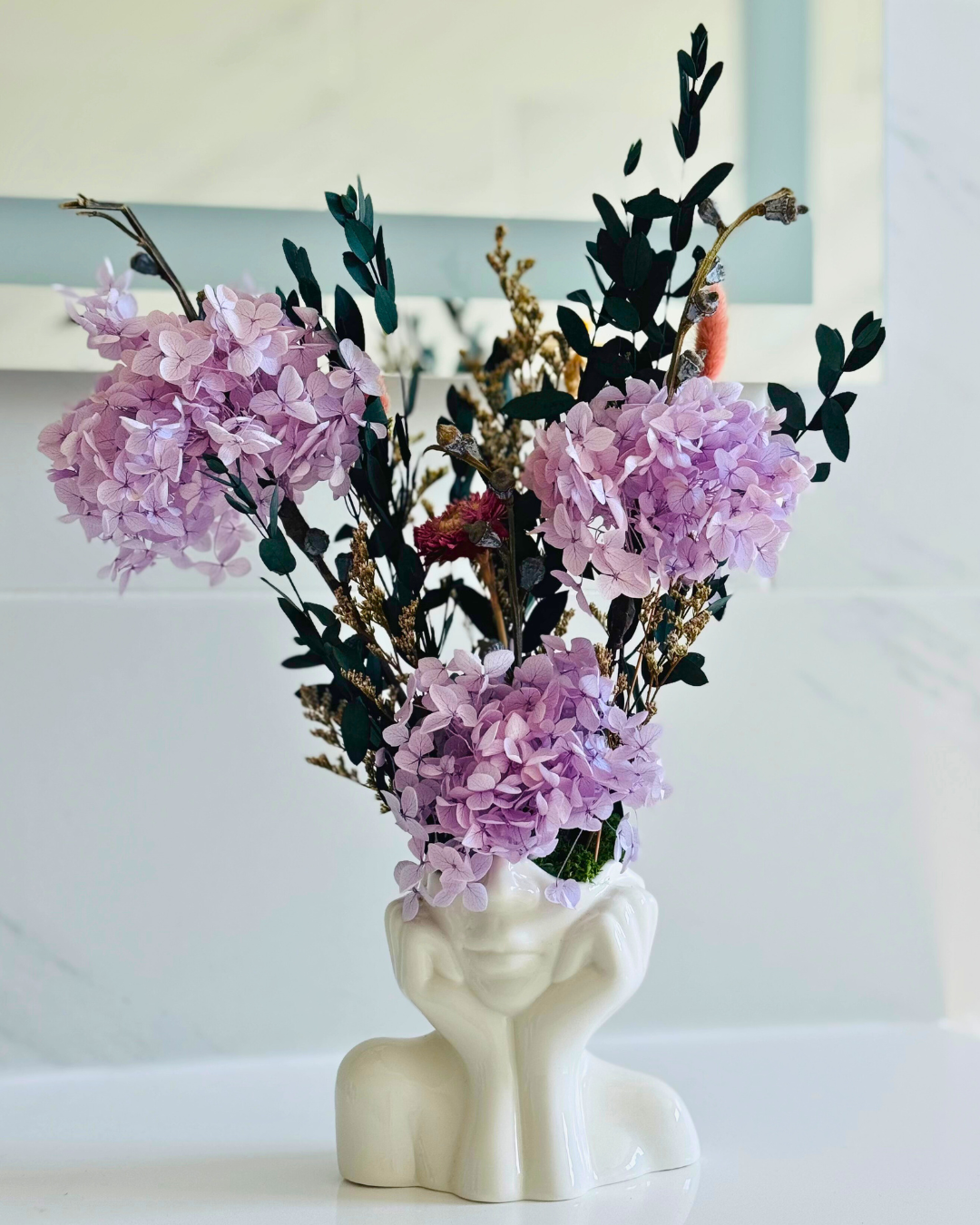 Dried Hydrangeas and Eucalyptus Fruits in Lady Figural Vase – Lavender
