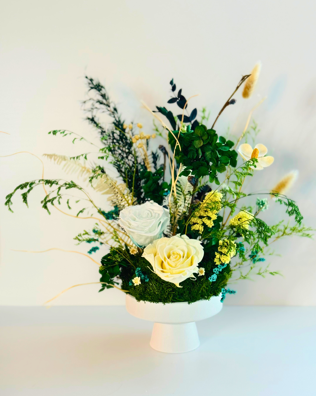 Elevate your space with Fleur Reverie's Harmony Preserved Arrangement in White Vase, a timeless blend of white roses and hydrangea that fosters calm and balance. Crafted from 100% natural, sustainably sourced flowers, this biophilic design captures nature's essence without the upkeep of fresh or artificial alternatives. The soft white roses symbolize purity and serenity, while the full hydrangea blooms add a touch of abundance, creating a focal point that reduces stress by 37% (University of Exeter, 2023) and enhances mood. Perfect for high-earning women seeking wellness in their Austin homes or corporate offices needing a productivity boost.