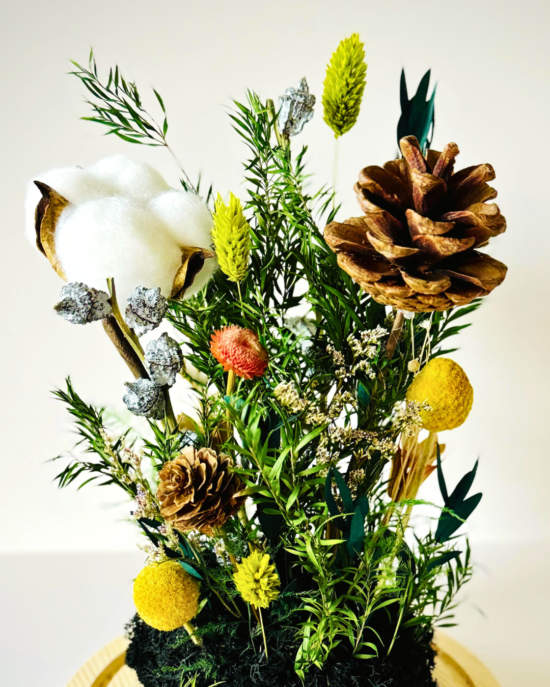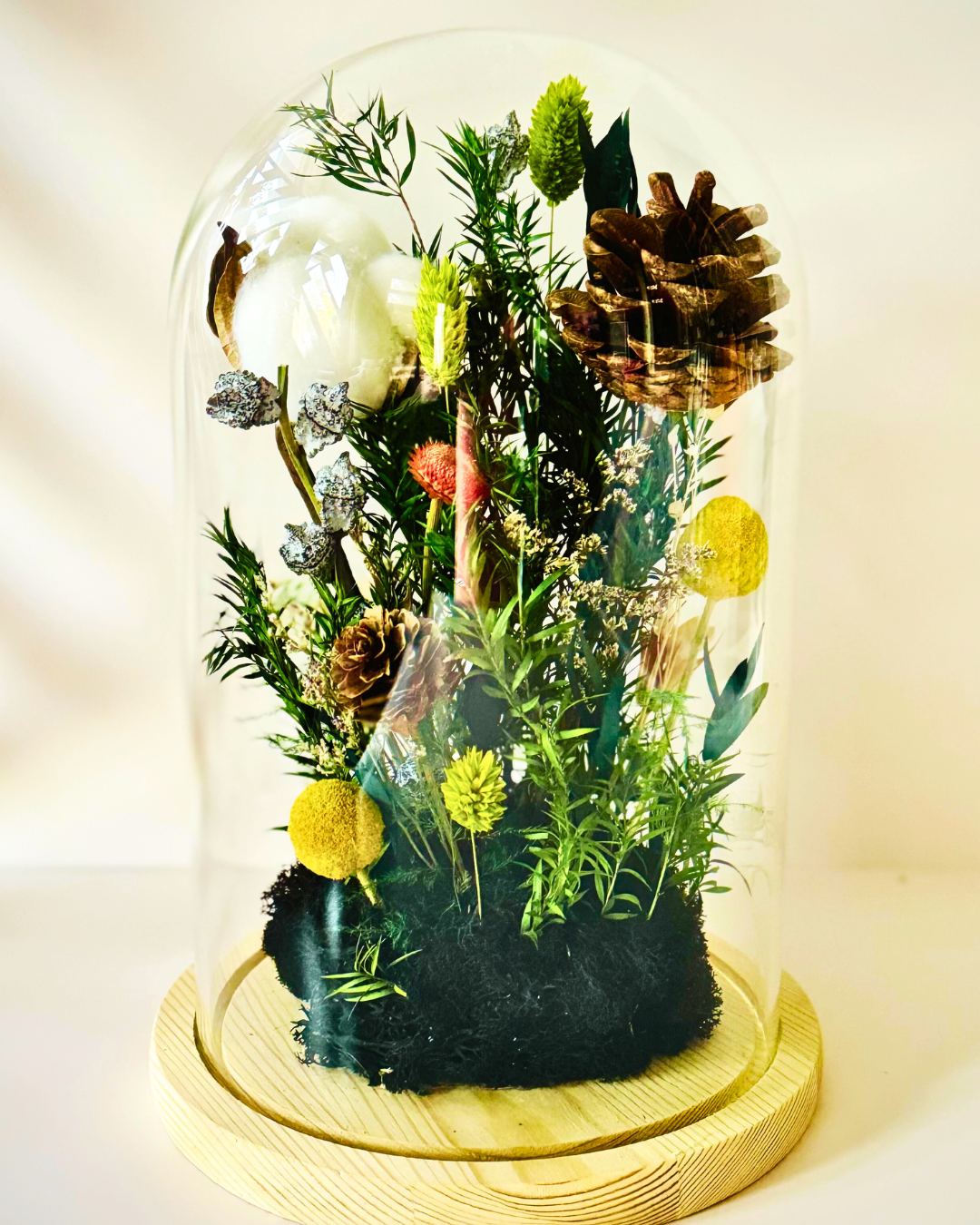 A timeless preserved flower arrangement displayed under a large clear glass dome with a wooden base. This sculptural piece blends softness and structure, offering a quiet yet powerful statement. Designed to bring depth, warmth, and lasting beauty into a space, it functions as both floral art and a grounding decor accent—inviting reflection, connection, and stillness.