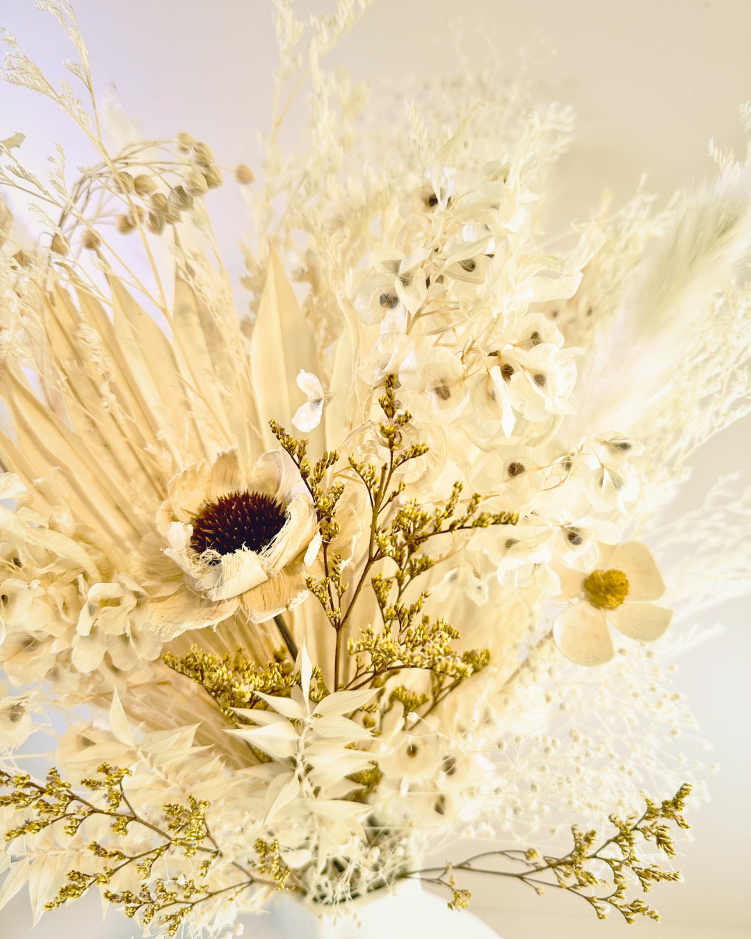 Display this arrangement on a console table, open shelf, or bedside table where its sculptural form can stand alone. It pairs beautifully with natural wood, linen, or stone finishes. Style solo for a minimal statement or layer with stacked books and ceramics for a textured, calming vignette.