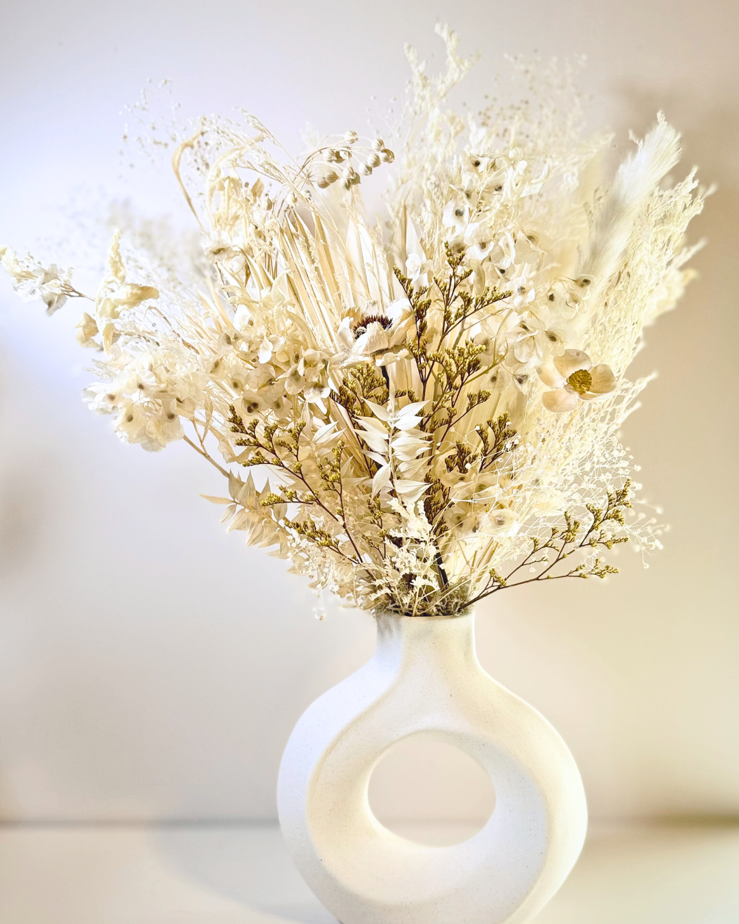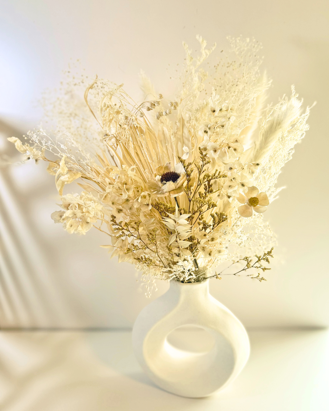 A sculptural preserved flower arrangement featuring soft white botanicals displayed in a matte white ceramic donut-shaped twisted vase. This piece blends simplicity with quiet elegance, offering a calming presence and subtle texture. Designed to bring balance and clarity into a space, it acts as both floral art and an architectural accent—refined, minimal, and timeless.